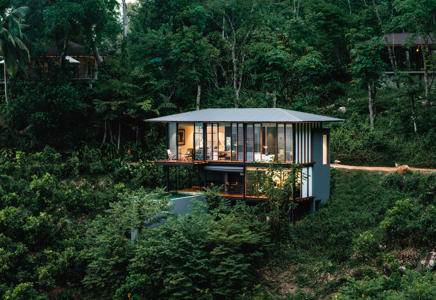 칼루타라의 작은 언덕 위, 고무나무와 계피나무에 둘러싸인 39만m² 규모의 부지에 자리한 글렌로스 리빙은 목가적인 휴식처다. 참여형 투어 외에도 호텔은 웰빙 중심의 다양한 프로그램을 운영한다. 야외 자연 스튜디오에서 요가와 명상 수업이 열리고, 손님들은 고대 스리랑카 무술인 앙감포라Angampora도 배울 수 있다. 본채에는 객실 세 개가 마련되어 있는데 1882년 스코틀랜드인 농장주가 지은 건물로, 영국 시골을 연상시키는 하얀 외벽이 특징적이다. 그러나 이곳의 진정한 자랑은 RIBA 건축상을 수상한 스리랑카의 팔린다 칸난가라 건축사무소Palinda Kannangara Architects가 설계한, 지면에서 살짝 떨어진 형태의 이층 풀빌라 일곱 채다. 미니멀한 매력이 돋보이는 객실은 깔끔한 선과 원목 바닥 그리고 부드러운 색감의 패브릭으로 꾸며져 있다. 천장에서 바닥까지 이어진 유리문을 열고 넓은 데크로 나가면 새소리와 귀뚜라미 울음소리가 울리는 안개 낀 계곡이 한눈에 펼쳐진다. 그리고 이 모든 것의 주인공은 밀림 위로 떠 있는 듯한 프라이빗 인피니티 풀이다.