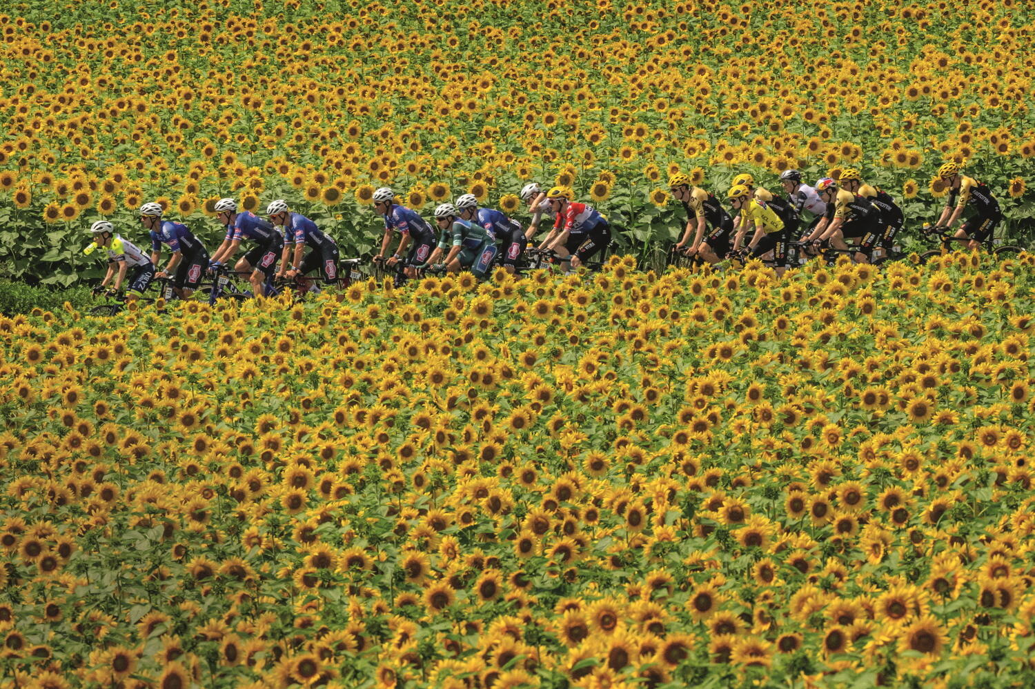 투르 드 프랑스Tour de France를 취재하는 사진작가에게 가장 담고 싶은 장면이 무엇인가 묻는다면 아마도 이 같은 장면을 먼저 떠올리지 않을까. 이 사진이 촬영된 장소는 리부른Libourne과 리모주Limoges 사이 구간으로, 사이클리스트들은 프랑스 누벨아키텐Nouvelle-Aquitaine 지역의 비옥한 농업 지대를 통과하는 중이었다. 도로 양옆에는 해바라기밭이 끝없이 펼쳐져 있고, 이 장소에서 마주친 펠로톤(선두 집단)을 촬영할 수 있었던 건 정말 큰 행운이었다.