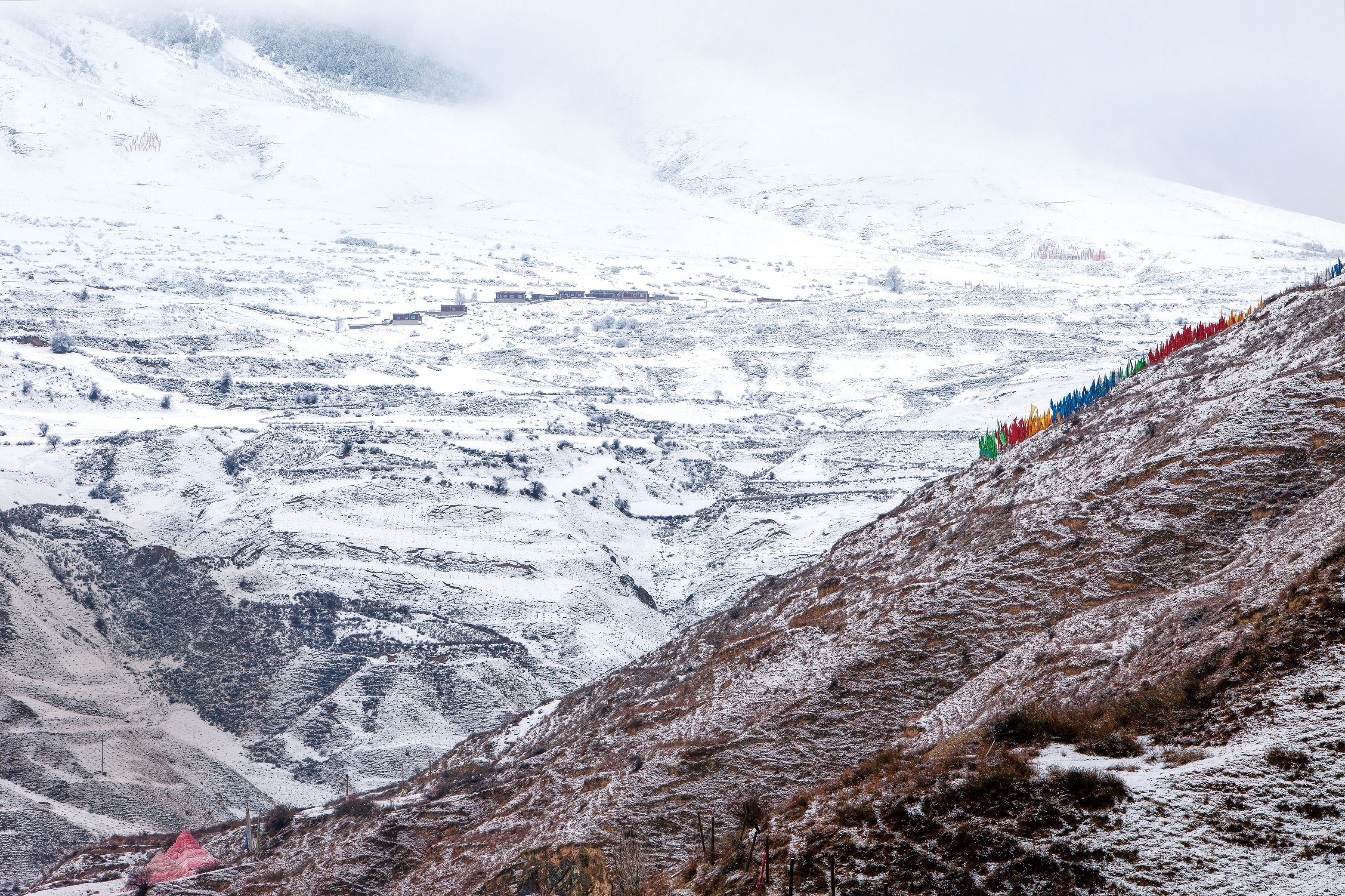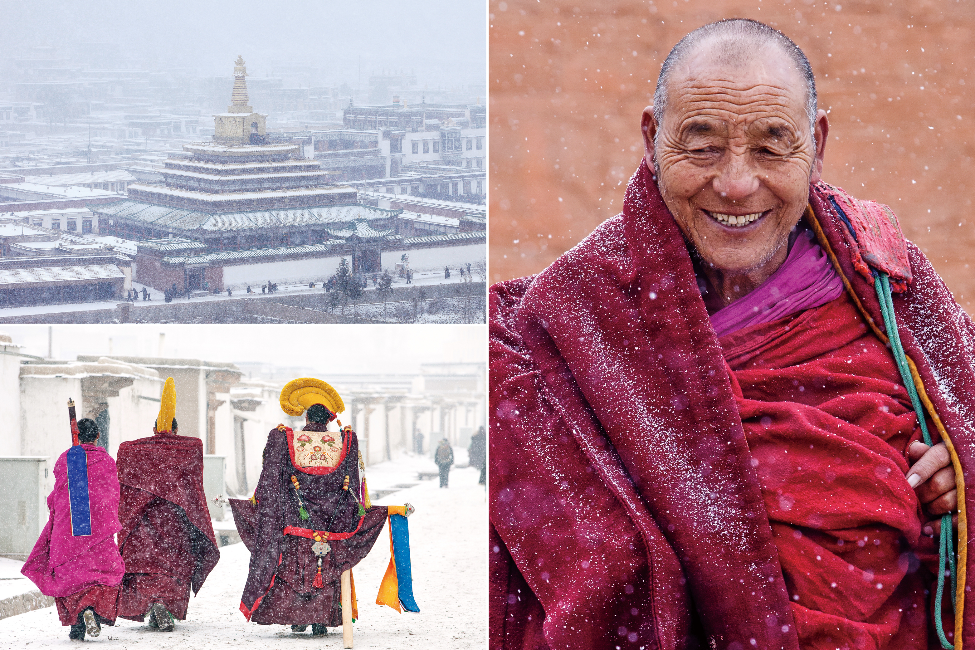 1409년 처음 시작된 몬람Monlam은 티베트 불교의 최대 명절이자 대규모 불교 의식으로, 새해를 전후로 티베트의 거의 모든 사원에서 열리며 세계 평화를 기원하고 불심을 전파한다. 예불이 끝나고 경내를 이동하는 이들이 흩날리는 눈발 사이에서 시선을 붙든다.