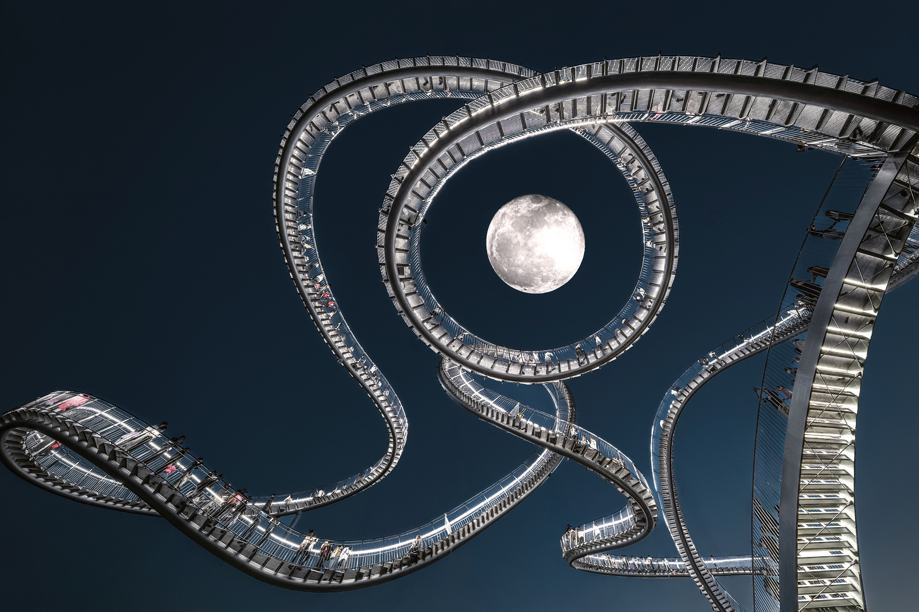 ‘스페이스워크’는 이름처럼 우주 공간을 유영하듯 걸으며 포항 도심과 바다를 한눈에 담을 수 있는 건축물이다. 초광각렌즈를 통해 이 구조물의 압도적인 위용과 역동적인 곡선을 표현하고자 했다. 우주정거장에 떠 있는 듯한 느낌을 강조하기 위해 망원렌즈로 보름달을 별도 촬영하였고, 건축물을 지탱하는 철제 구조물은 후보정을 통해 간결하게 정리했다. 해외에서는 정형화된 건축 사진보다는 다양한 기법을 통해 건축물에서 영감을 이끌어내는 창의적 접근이 일반화되어 있다. 우리나라에도 독창적이고 아름다운 건축물이 많기에 이를 세계에 알리고 싶었다. 한국 건축의 매력을 새로운 시각으로 바라보고자 한 이 시도는 2025년 IPA(International Photography Awards) 국제사진공모전 건축 부문(Abstract) 1위라는 결실로 이어졌다.