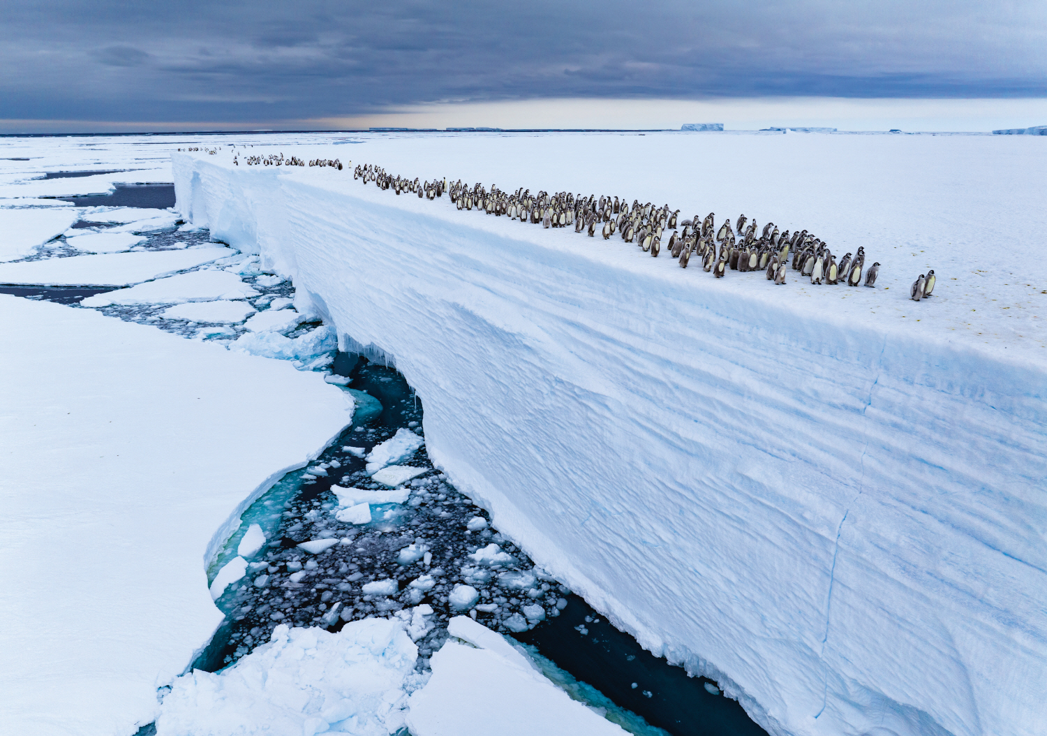 황제펭귄 새끼들은 먹이를 찾기 위해 남극의 차가운 바다로 향해야 한다. 나는 두 달 동안 같은 펭귄 무리를 따라가며 대부분의 새끼들이 얼음 경사면을 이용해 바닷가로 내려가는 모습을 관찰했다. 그러나 그중 일부는 해빙이 예년보다 일찍 녹으면서 길을 잃기도 했다. 해안선을 따라 드론을 띄우던 어느 날, 나는 새끼 한 마리가 지평선 너머로 사라지는 모습을 포착했다. 그 방향으로 기체를 돌리자 엑스트룀Ekström 빙붕의 가장자리를 따라 이동하는 수백 마리의 새끼 펭귄이 모습을 드러냈다. 결국 그들은 15m 아래 바다로 뛰어내리는 선택을 할 수밖에 없었다.