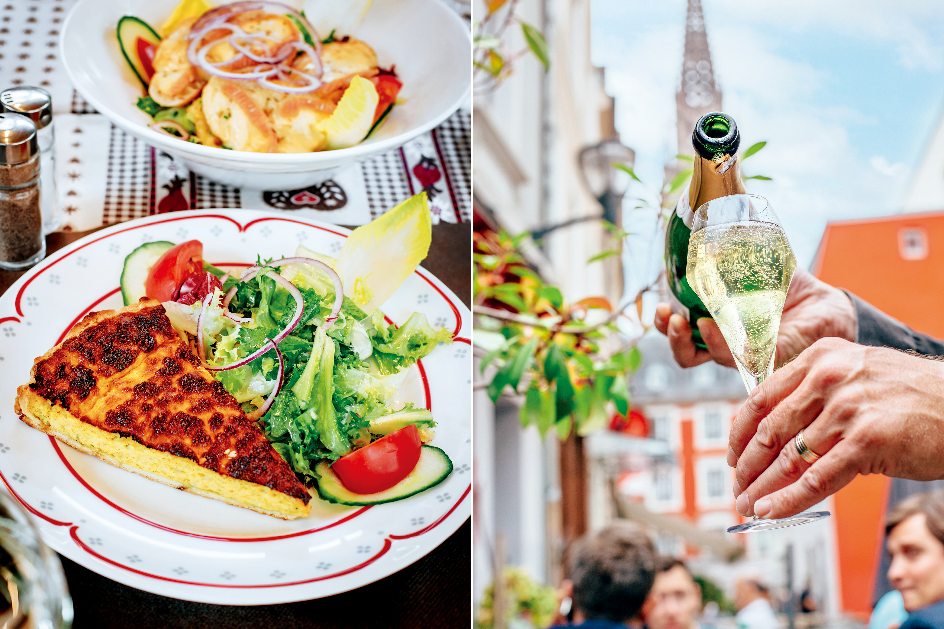 알자스의 음식은 여느 프랑스 지역과 달리 이곳만의 전통이 있는데, 국경을 맞댄 독일과의 오랜 역사 속에서 두 문화가 자연스럽게 스며들었기 때문이다. 훈제 돼지고기와 소시지, 감자를 곁들인 양배추 요리 슈크루트choucroute는 독일의 사우어크라우트를 연상시키고, 화이트와인에 큼직하게 썬 돼지고기와 감자, 당근, 양파를 넣어 오랜 시간 익힌 베크오프baeckeoffe는 깊고 묵직한 풍미를 전한다. 얇은 반죽 위에 베이컨과 크림, 양파를 얹어 화덕에 구운 타르트 플랑베Tarte Flambée는 담백하면서 꾸밈없는 가정식 그 자체. 시원한 알자스식 전통 맥주나 리슬링 와인에 곁들이기 딱 좋다.