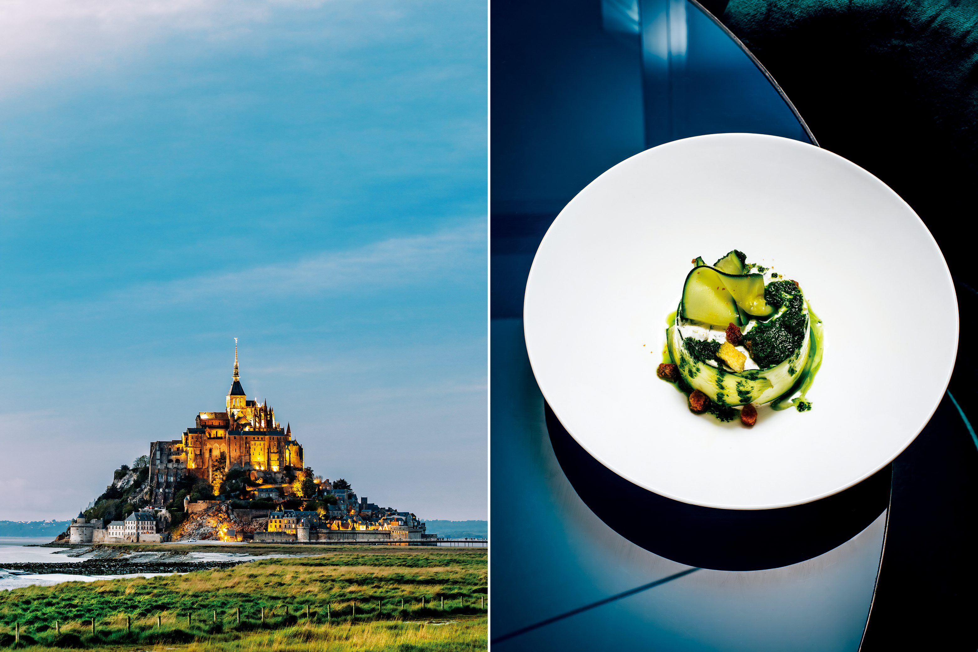 차장 너머로 펼쳐진 드넓은 초원과 그 위를 거니는 소들을 바라보는 사이, 여지없이 한차례 비가 쏟아졌다. 그리고 하늘은 다시 맑게 갠다. 그렇게 도착한 몽생미셸은 작은 바위섬 꼭대기에 800년에 걸쳐 완성된 수도원이다. 밀물이 가장 높은 때가 되면 육지는 바닷물에 완전히 잠겨 마치 바다 위에 섬이 떠 있는 듯한 풍경을 만들어낸다. 지금은 다리를 통해 편히 건널 수 있지만 과거의 순례자들은 7km에 달하는 갯벌을 건너 이곳에 도착했다. 신을 만나기 위한 하나의 수행인 셈이다. 그 험난한 여정 끝에서 그들을 품어준 것이 바로 따뜻한 음식이다. 130년 전 그들을 맞이했던 라 메르 풀라르La Mère Poulard에서는 지금도 장작불 위에서 오믈렛을 굽는다. 흥겨운 리듬에 맞춰 오믈렛 반죽을 섞고 장작불에 굽는 모습을 구경하는 동안 폭신한 수플레 오믈렛이 프라이팬째로 나온다. 오믈렛은 하나만으로도 든든할 만큼 커서 그 크기에 압도되고, 부드러운 식감과 입안 가득 퍼지는 풍미에 또 한 번 놀란다. 여행 중 만난 노르망디산 우유와 치즈, 시드르 그리고 약초로 약을 제조하던 수도사들이 우연히 발견한 리큐어 베네딕틴Bénédictin까지. 이 모든 것이 자연이 오랜 시간 준비해 온 선물처럼 느껴진다.