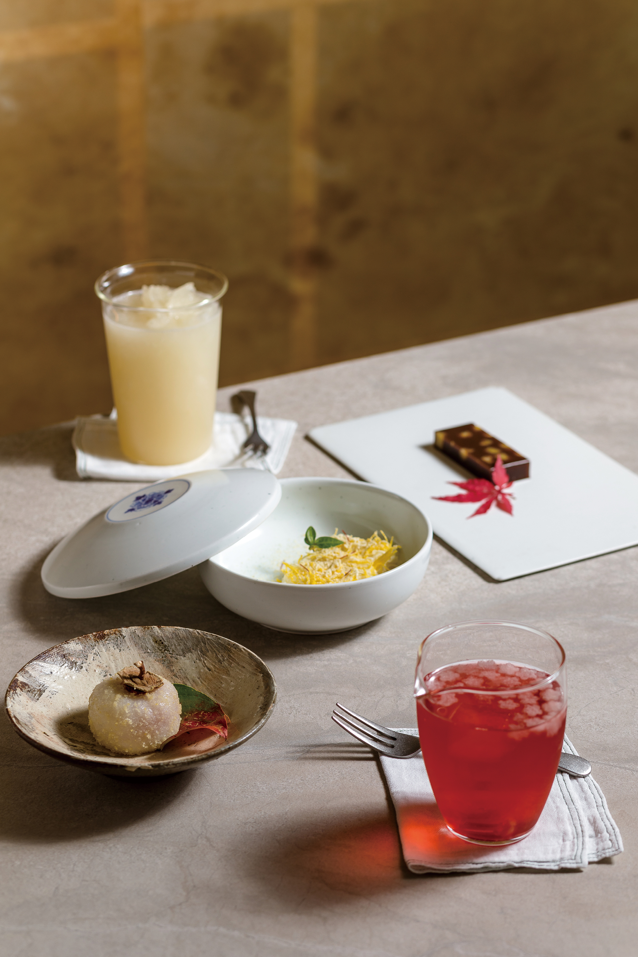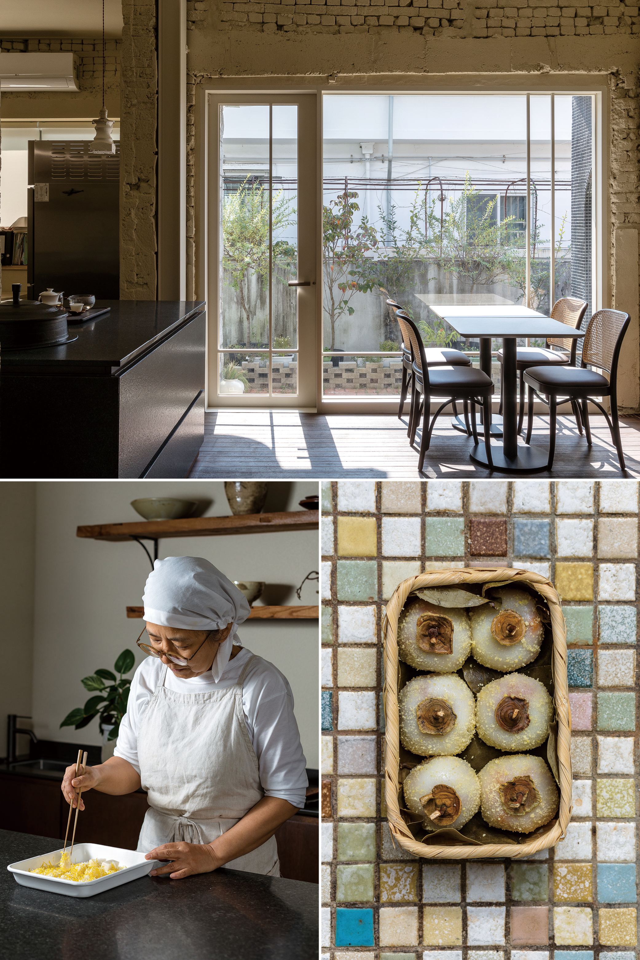 강신혜 대표는 나무 도마 위에서 흰자와 노른자를 분리해 만든 달걀지단을 곱게 채 썰어 ‘화병’을 만들 준비 중이다. 이 메뉴 역시 <반찬등속>에 기록된 레시피를 온전히 구현한 것으로, 쫀득하게 치댄 인절미를 잘게 채 썬 달걀지단에 살살 굴려 묻히고, 실고추를 올려 마무리한다. 이어 가을 기운을 온전히 담아낸 곶감 단자와 밤양갱이 차례대로 테이블에 오른다. 오래된 조리서의 한 페이지가 눈앞에 되살아나는 순간이다. 연잎주 만드는 방법을 각색하여 연잎에 밥을 싸서 만든 연잎 식혜에서는 은근한 단맛이 뒤따라오고, 오미자 화채는 고운 빛깔 속 다채로운 맛이 미각을 일깨운다.