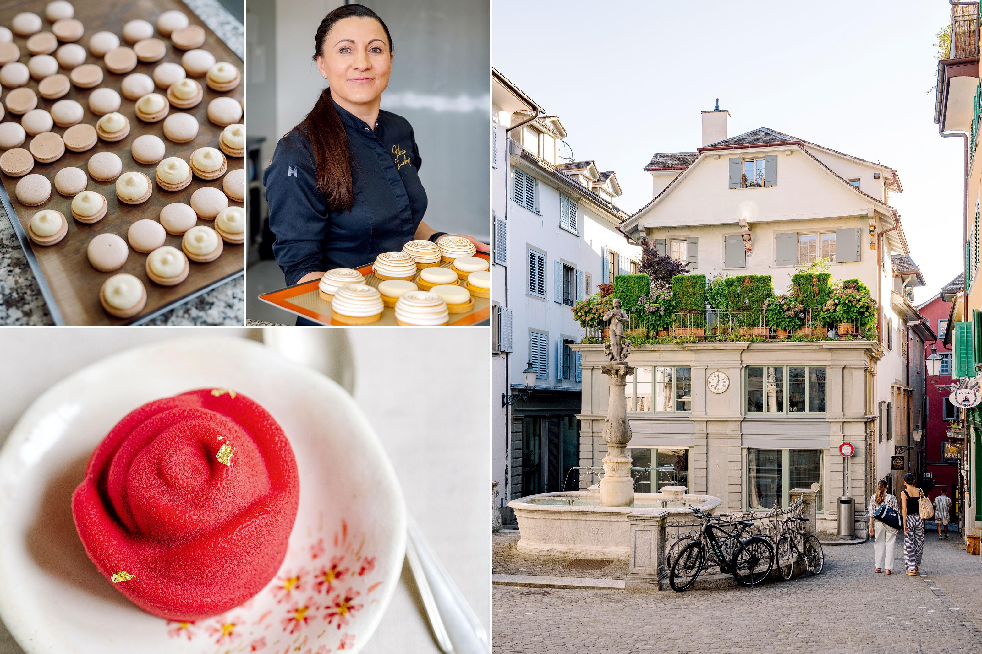 그녀는 이제 ‘2022년 올해의 파티시에’로 선정된, 고전 디저트를 혁신적으로 재해석하는 젊은 장인으로 이름을 알리고 있다. 취리히의 지펠트Seefeld 지구에 있는 자신의 스튜디오에서 다양한 작품을 선보이는데, 샴페인 마카롱(위 왼쪽), 스다치 감귤 향이 더해진 붉은빛 화이트초콜릿 장미(아래 왼쪽), 망고·패션프루트 젤리와 레몬 커드, 머랭이 어우러진 레몬 타르트(위 오른쪽) 등이 그것이다.